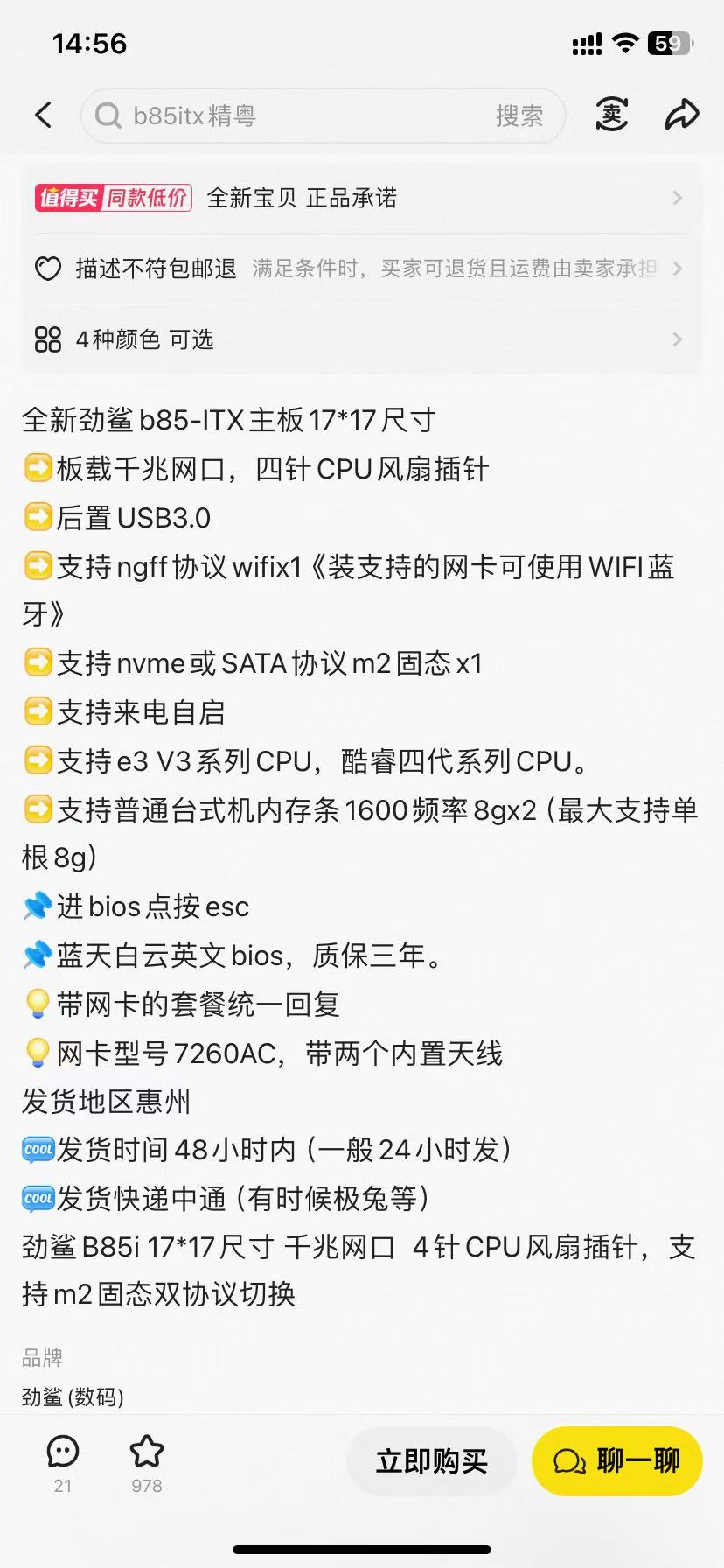 对应了不同的尺寸,这将影响到主板到底能否放进机箱。因此我在买 NAS 机箱的时候已经和卖家确认了,机箱只能放的下 itx 。因此直接去闲鱼上淘 itx 的二手主板。