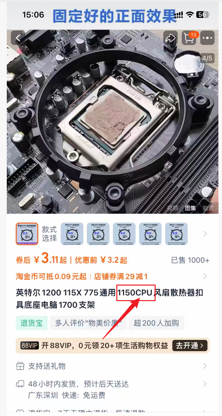 买了散热器,准备安装的过程,突然发现散热器没支架,又去淘宝买了散热器支架,没这个东西散热器是无法固定到主板上的。而散热器支架也和 CPU 规格挂钩,像我在网上搜了,我 CPU 是 1150 针,刚好就看到个 1150 针的散热器支架。如下图所示