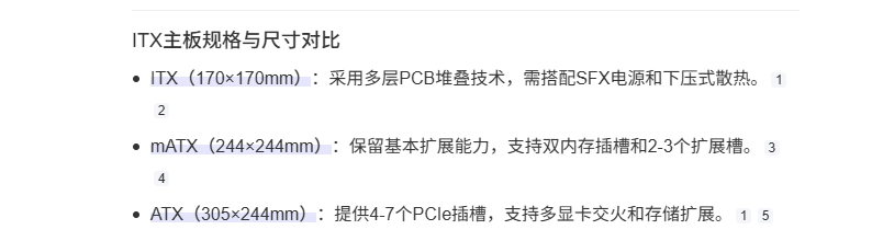 上文已经提到了,主板和机箱要搭配去看,主板有 itx 、atx、matx 这几种规格
