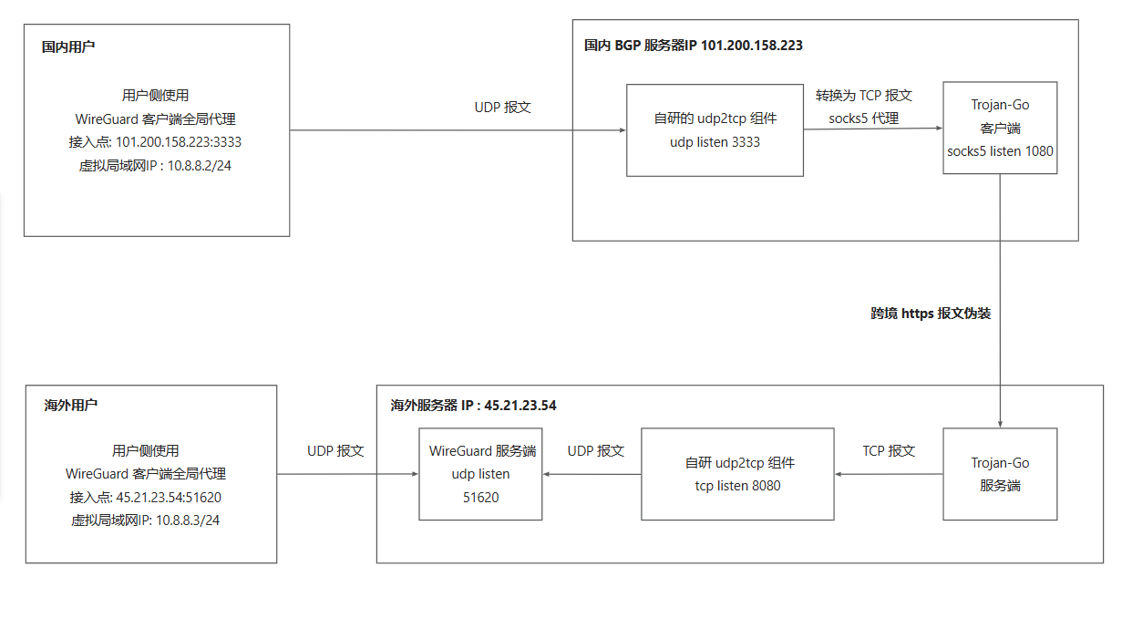 国内用户 ----WireGuard 客户端接入----> 国内服务器----Trojan-Go 封装 (wg的报文)--------> 海外服务器(卸载 Trojan-Go 协议) -------> WireGuard 服务。