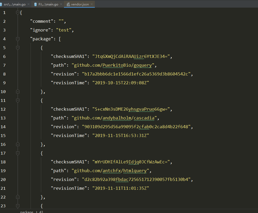 此时vendor.json中就会记录我们的包依赖信息如下图所示