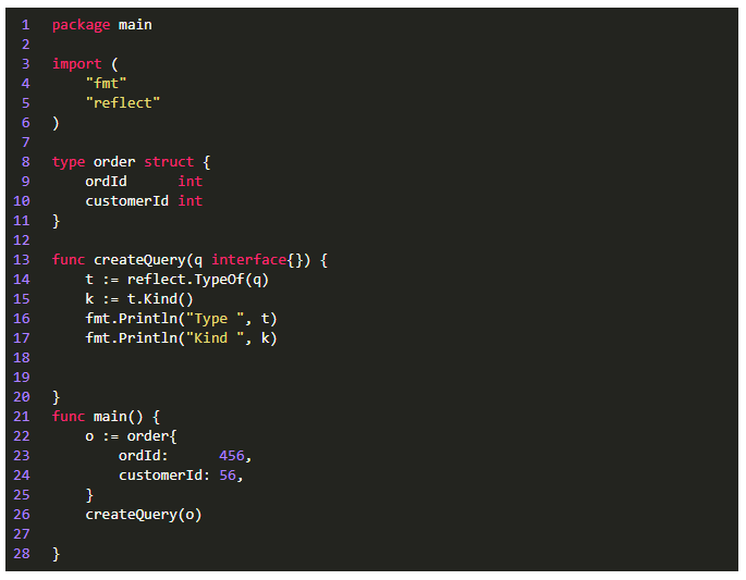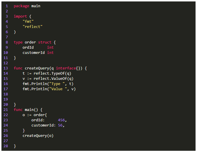 在上面的程序中,第 13 行的 createQuery 函数接收 interface{} 作为参数。在第 14 行,reflect.TypeOf 接收了参数 interface{},返回了reflect.Type,它包含了传入的 interface{} 参数的具体类型。同样地,在第 15 行,reflect.ValueOf 函数接收参数 interface{},并返回了 reflect.Value,它包含了传来的 interface{} 的具体值。