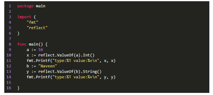 在上面程序中的第 10 行,我们取出 reflect.Value,并转换为 int64,而在第 13 行,我们取出 reflect.Value 并将其转换为 string。该程序会输出: