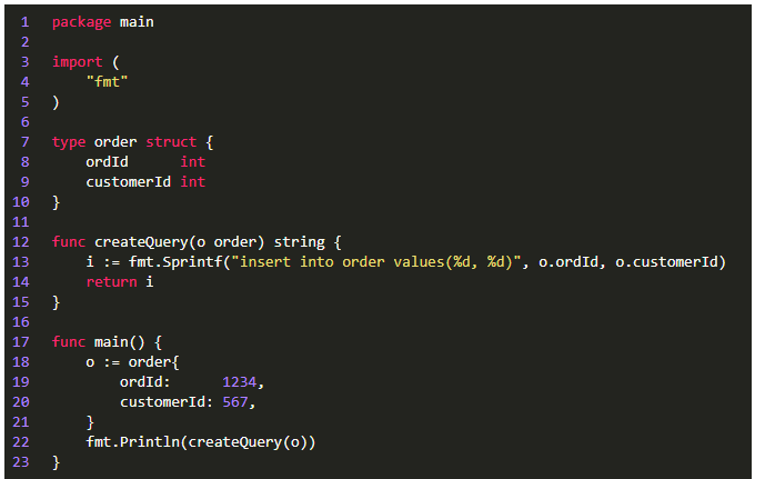在上面的程序中,我们需要编写一个函数,接收结构体变量 o 作为参数,返回下面的 SQL 插入查询。